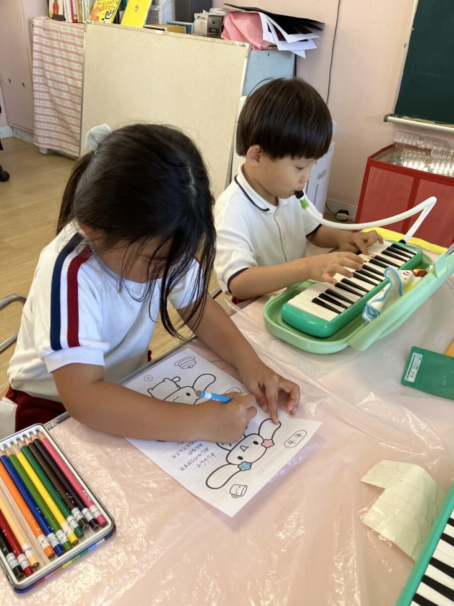 「おじいちゃん、おばあちゃんのところに行ったよ‼」「プールに行ったよ‼」「映画見に行ったよ♪」と夏休みの楽しかったことをたくさん話してくれました☆