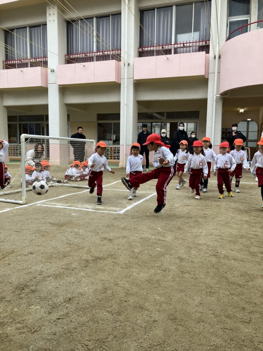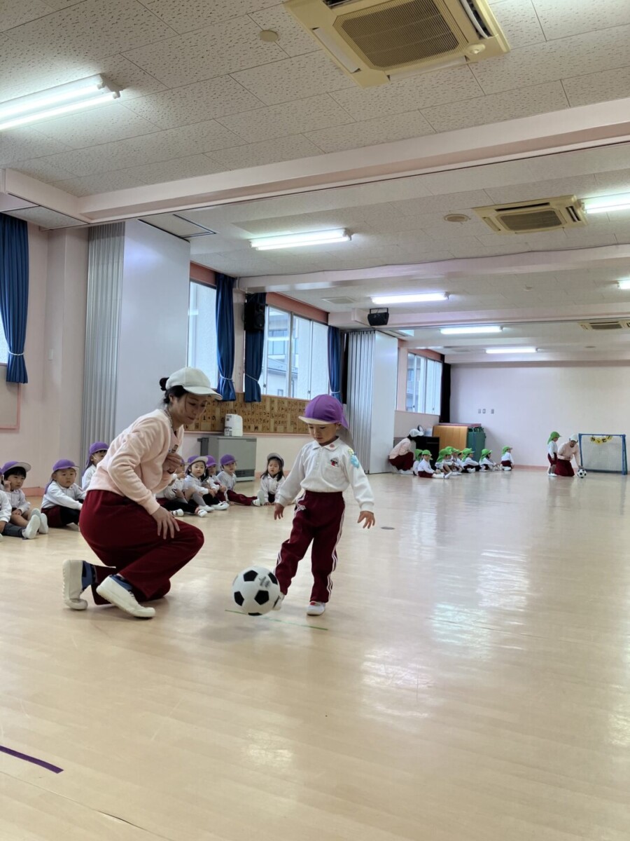 2歳児クラスは一人ずつゴールに向かってシュート‼決まったら自分の好きなポーズ😊