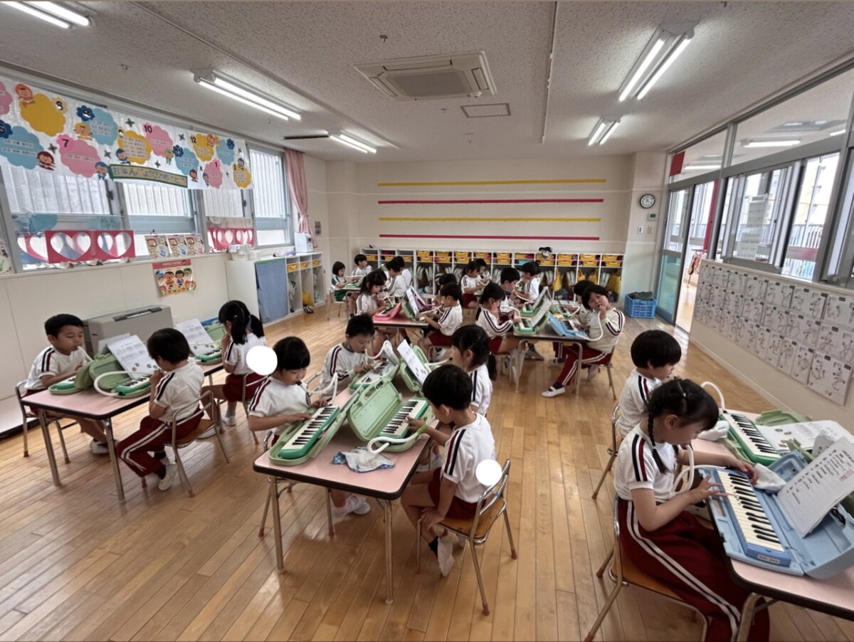 歌い終わったら「ぶんぶんぶん」を実際に弾いてみました!練習している姿を見ているとメロディオンカードを必死に見て1つずつ音を確かめながら弾けるようになるまで何度も繰り返し弾いていたりなどたくさん頑張っている姿が見られました!練習の時間には「先生聞いてください!」と言う子どもたちの声が聞こえ、実際に聞いてみると前回より上手に弾けていて驚きました!