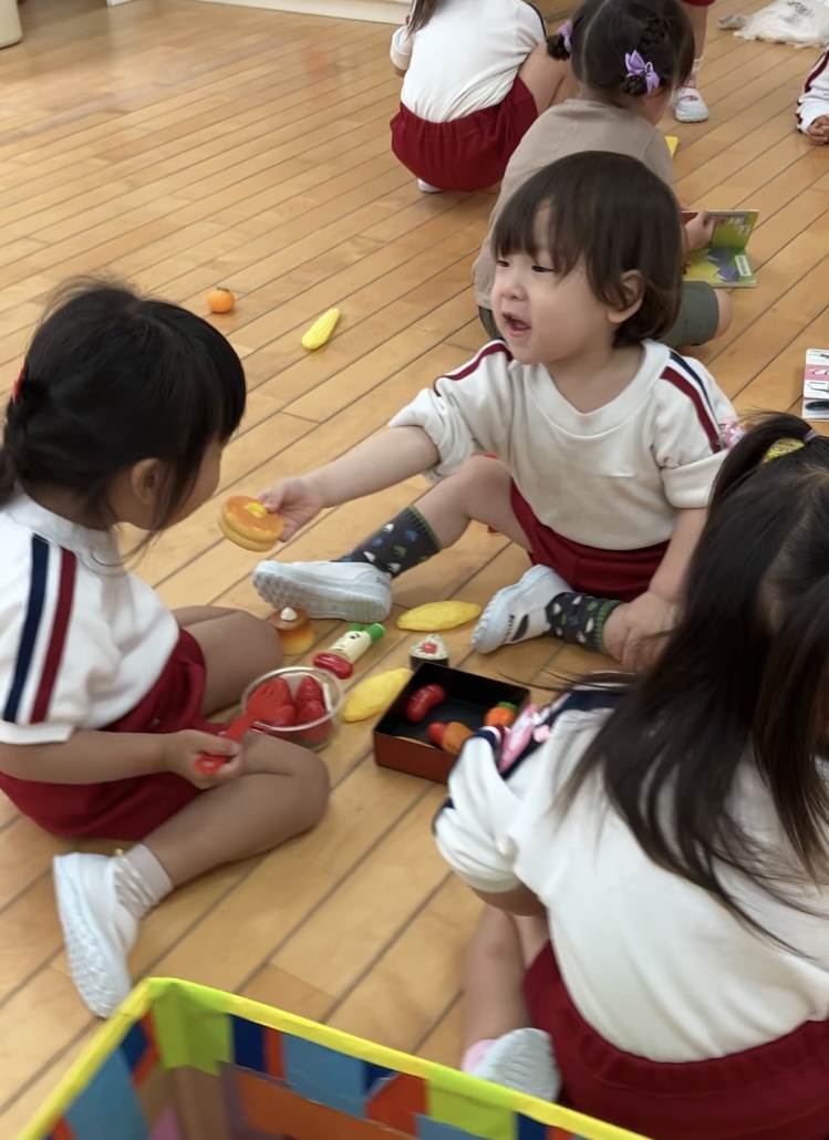 順番を待っているお友だちは、おままごと遊びや絵本読みを楽しみました。お友だちとのやりとりも増えてきて、仲良く楽しく過ごしています♪「はい(ど~ぞ)」「あむあむ♪」とかわいい様子や表情がいっぱいなので、保護者の皆様にもみていただきたいです♡