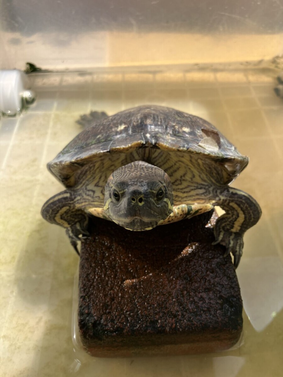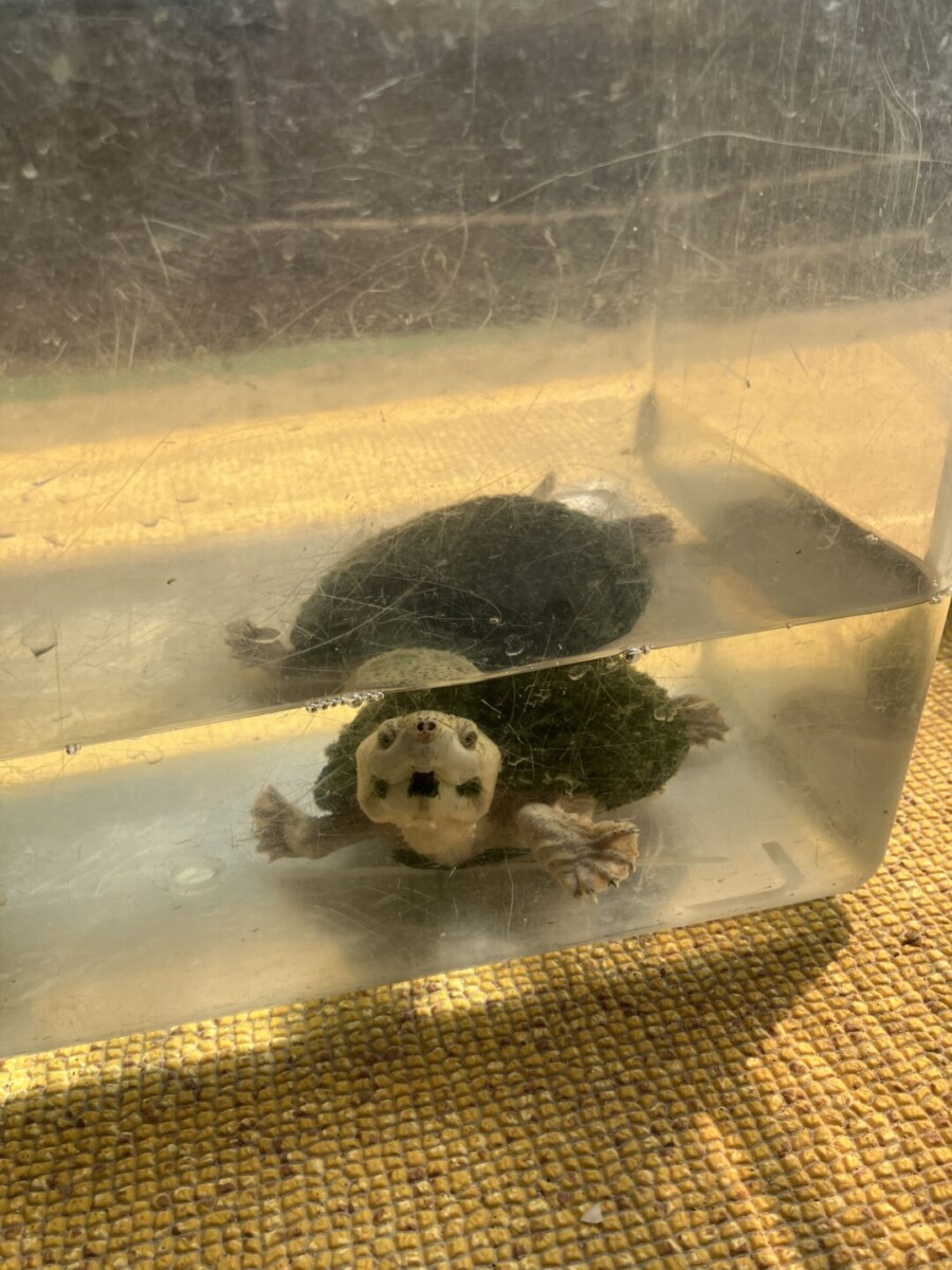 小さいほうのかめさんは、「ふくちゃん」という名前です。小さいので「あかちゃんかめさーん♡」と呼んでいるお友だちもいますが、10年以上はふくはま幼稚園にいるので、みんなより先輩なのです🐢ふくちゃんも話しかけると、こちらを見てくれます♪