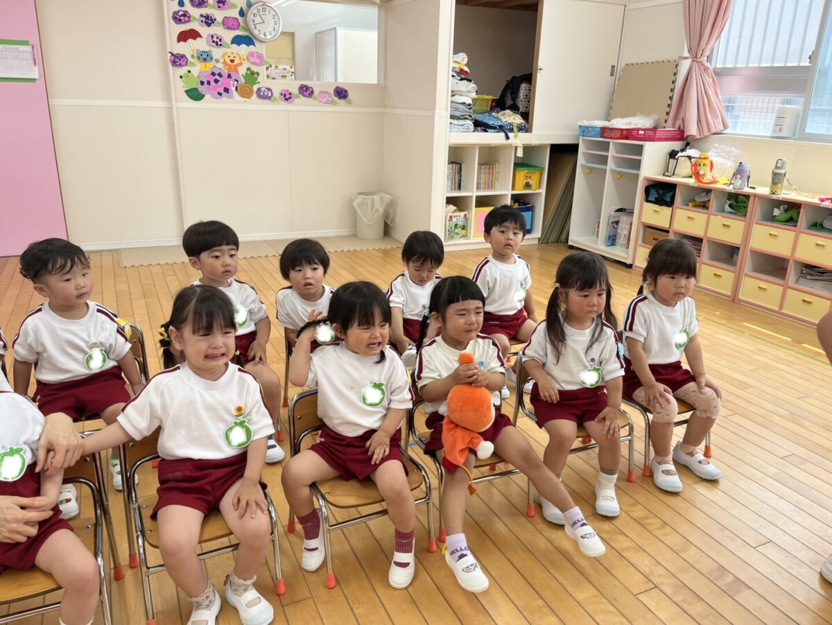今日は、毎年行われる検診の一つ「歯科検診」でした。先日行われた「内科検診」でも、大泣きのお友だちが何人もいたりんごぐみさん。毎年、歯科検診の方が泣く子が多いので、歯医者さんが来られる前に、練習で、教師が歯医者さんになって、ごろんと寝転がって、口を開けたり閉じたりする練習をしました!その時は、嫌がる子は数人で、ほとんどの子が上手にお口の中を見せてくれました。歯医者さんが来た時も、同じようにお口の中を見せるのをがんばれるように、おててにばいきんまんのスタンプを押して、頑張るパワーをためました!