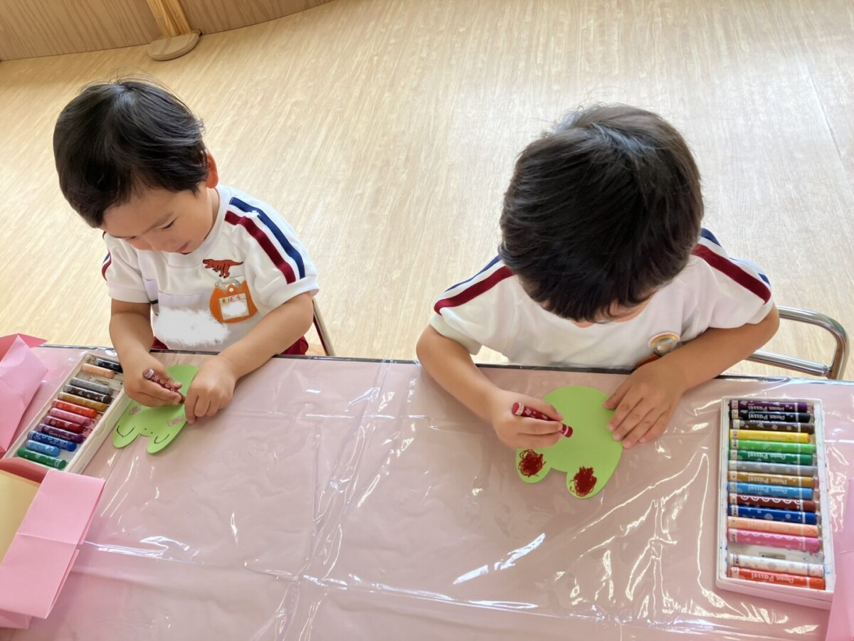 担任がカエルのお母さんを動かしながら「子どもたちがおたまじゃくしから、なかなかカエルになれなくて心配で困っているケロ、、、」と言うと、「○○ちゃんがしてあげる!」「手伝ってあげる!」と子どもたち。「糊もクレパスも持ってるから!」とわざわざお道具箱を開けて見せてくれる子もいました!困っている人(カエル)を助けてあげようとするみんなの優しさにほっこり😊しました。