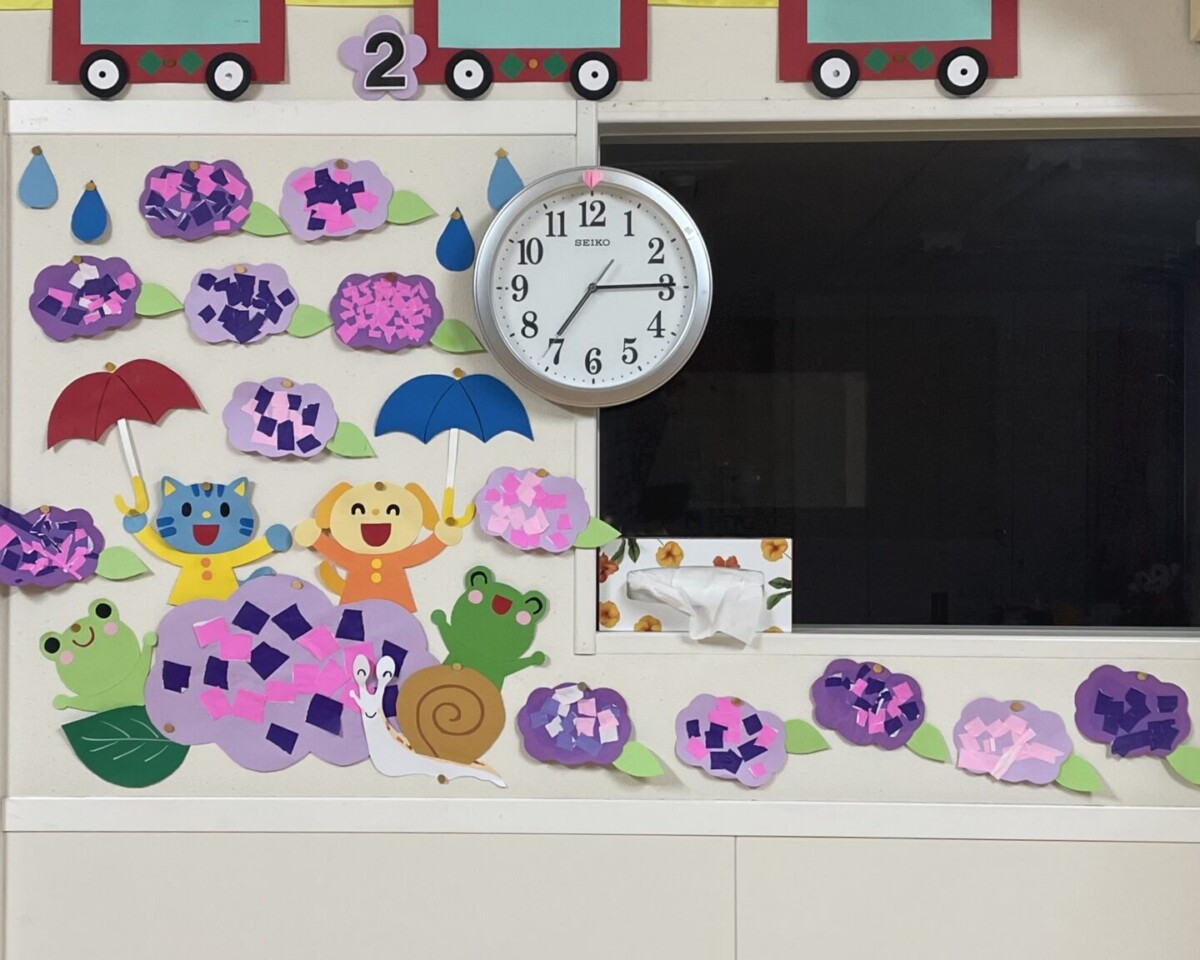 完成したあじさいは、かたつむりののんちゃんと一緒に壁に飾りました!