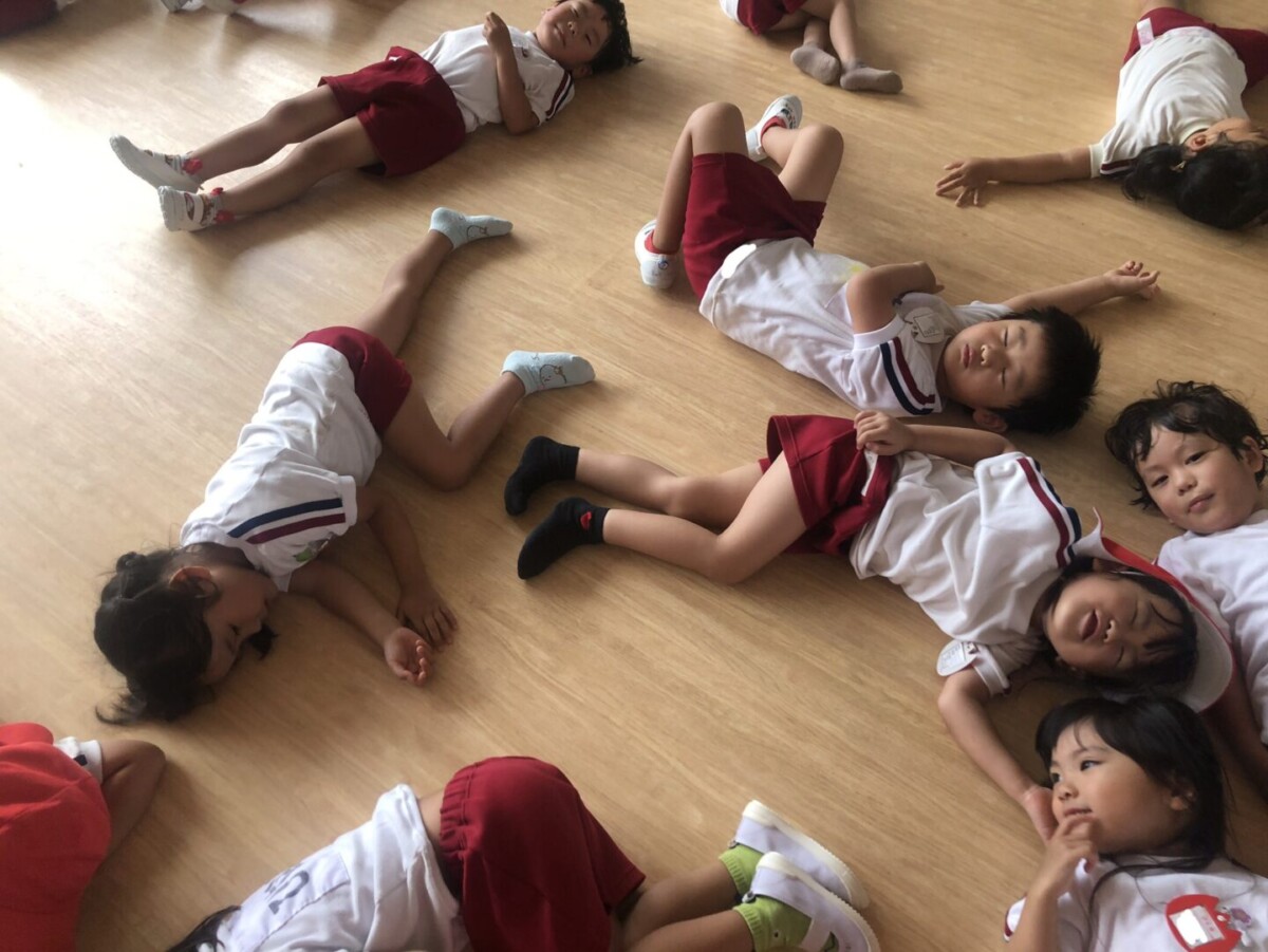 「お外暑かったからみんなで休憩しよー!」と声を掛けると、「しよしよ!」「休憩しないと体がきついからね」と言って、床にごろーん。リラックスタイムです✨