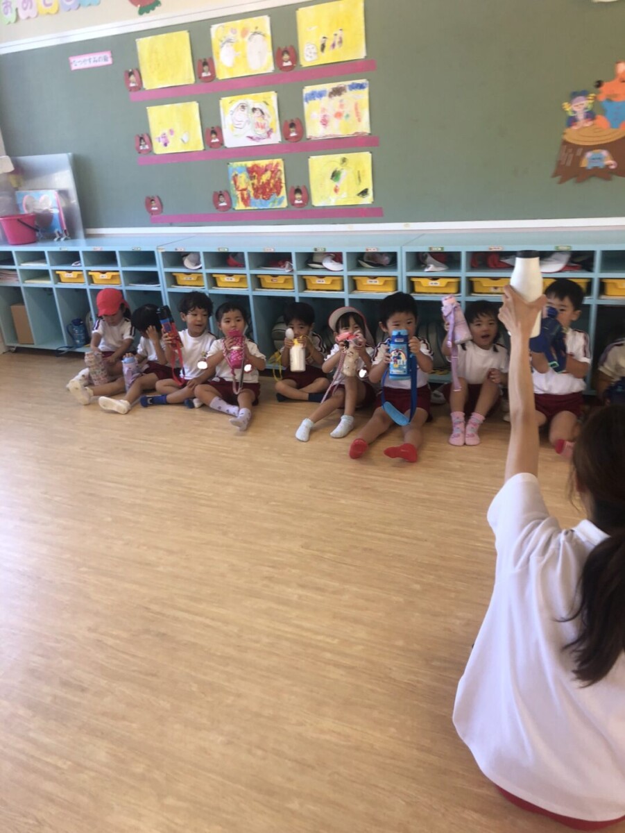そこで、さくら組では、戸外遊びを終えた後は「かんぱーい」の掛け声でしっかり水分補給をして、ひと休み😊