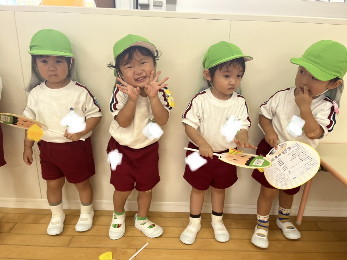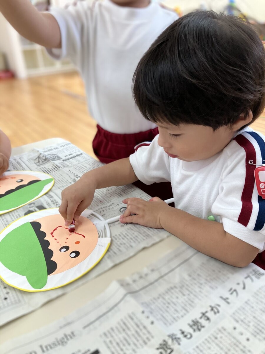 プログラムが書かれた面の裏側は、自分たちの似顔絵を描きました♪2歳児さんは、まだ、お顔を描くのは難しいお友達もいるので、目と鼻は、丸シールを貼って、口とほっぺの部分はクレパスを使って、自分で描きました!お顔を描く製作は、幼稚園に入ってから何回かしてきたので、目や鼻の貼る場所や、口やほっぺを描く場所もずいぶん上手に描けるようになりました♪