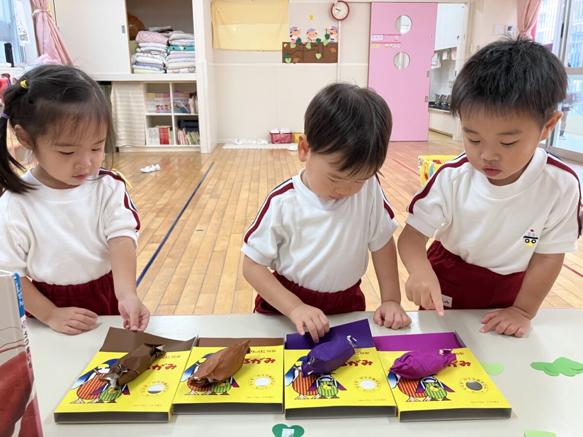 いちご組の教室に飾る『さつまいも』をみんなで作りました♪さつまいもの絵本を見ながら、「紫かな~」「これにする~!」と言って、まずは折り紙を選びます。自分で取ろうとする姿も見られるようになってきました。