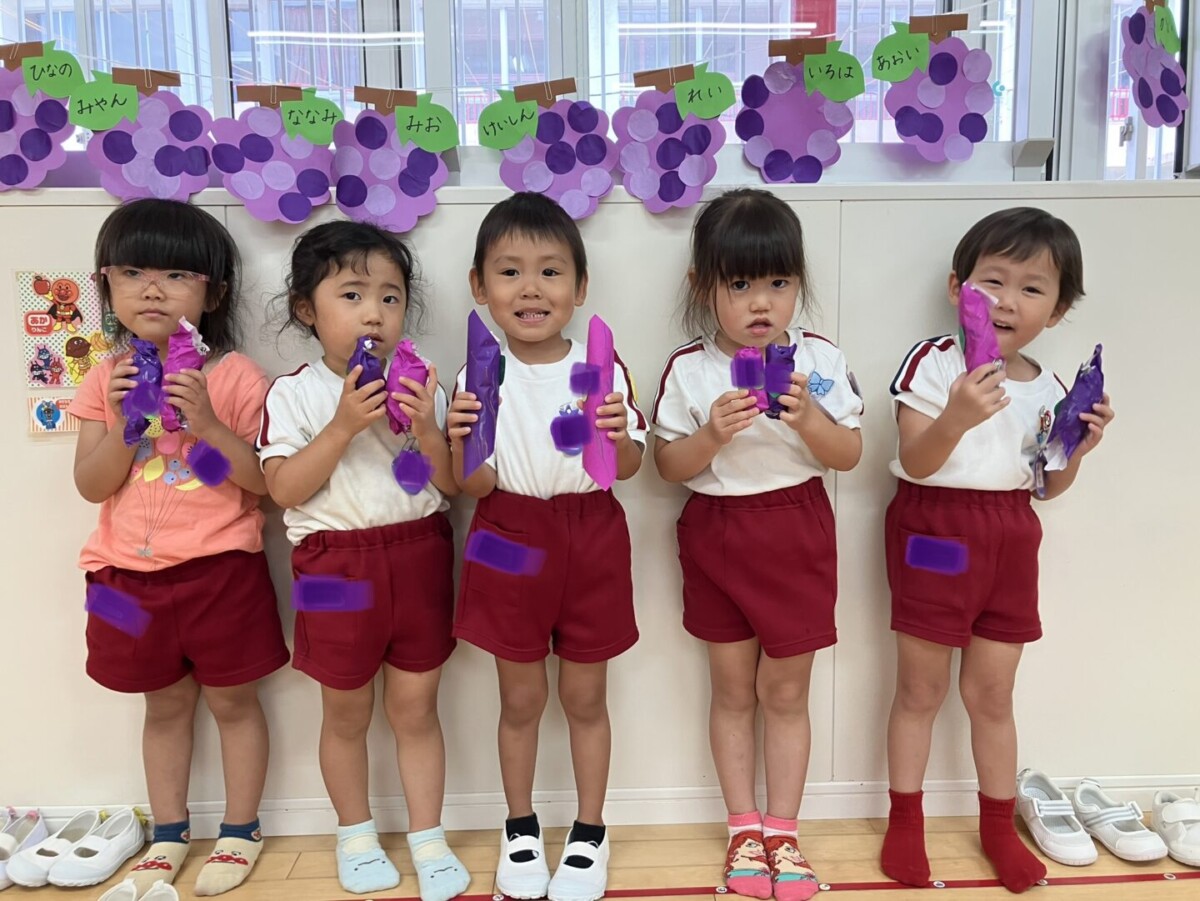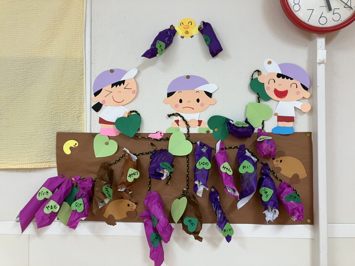 おいしそうな『ぶどう』の下で、これまたおいしそうな『さつまいも』を持って「ハイ、チーズ♡」 いちご組の教室が、さつまいもで華やいでいます♪
