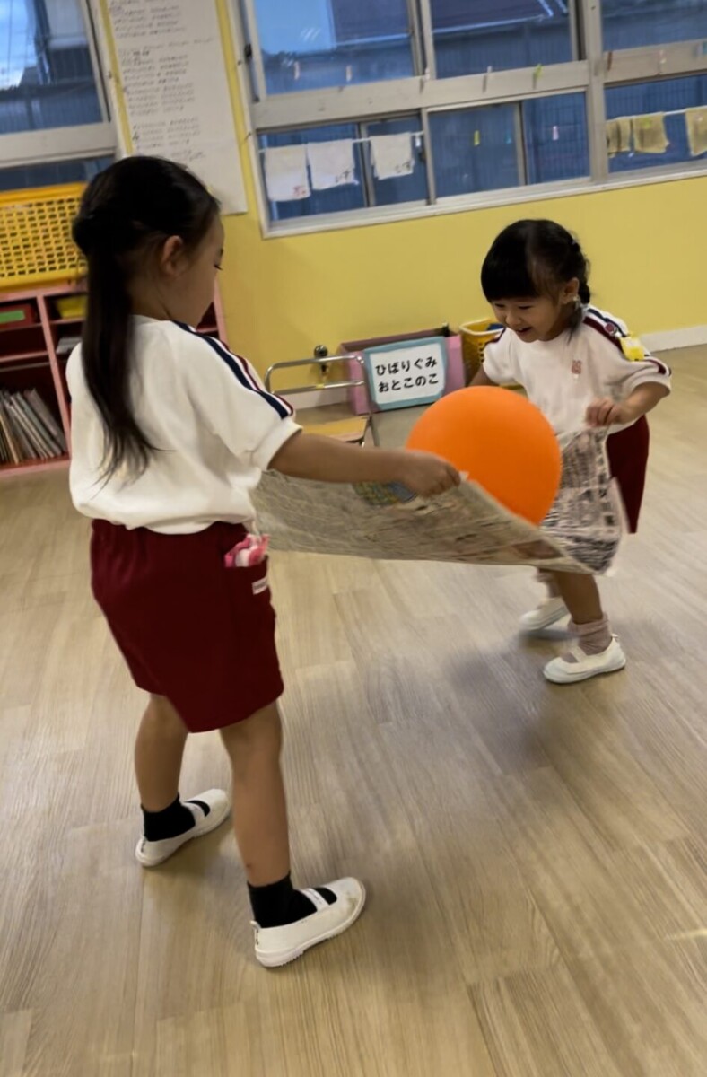2人1組になって、新聞紙の端と端を持ち、2人で協力しながらコースをグルッと一周して、次のお友達に繋げるゲームです✨