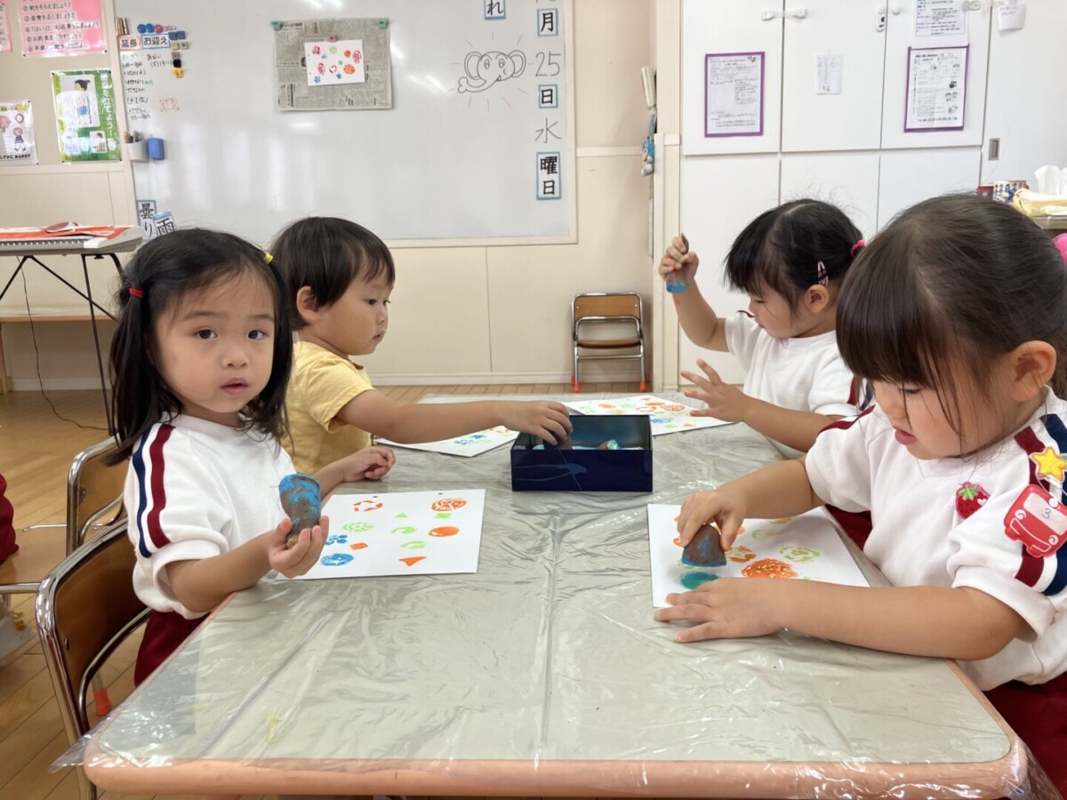 画用紙を配ったり、芋スタンプを机に置いたりする間、手を伸ばしたくなるところをしっかり我慢して、”手はおひざ”で待つこともでき、待ち方上手さんがいっぱいで感心しました😊