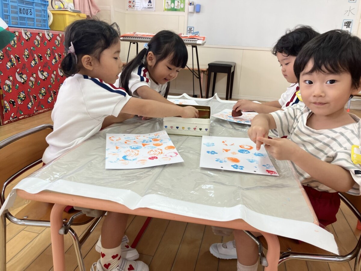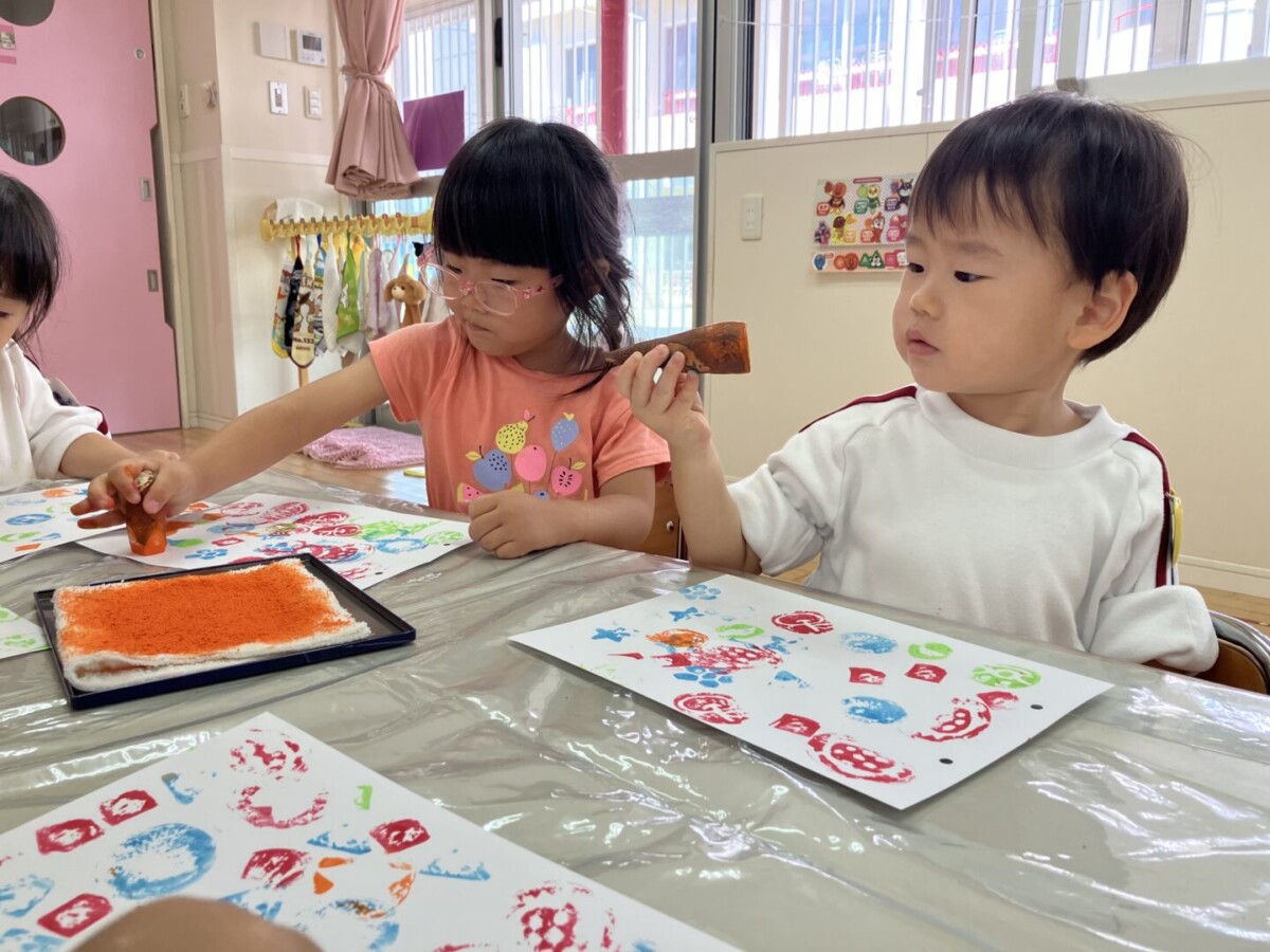 画用紙いっぱいに押して隙間なく埋めたり、気に入った形を見つけたら、そればかりを何度も押したりして「できましたー‼」「もう終わりー♪」「先生みてみてー‼」とたくさん発言もしながら最後まで楽しみましたよ。