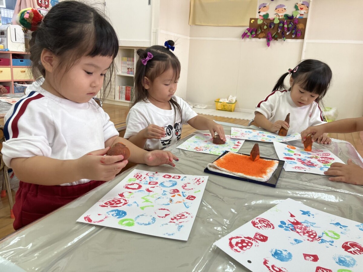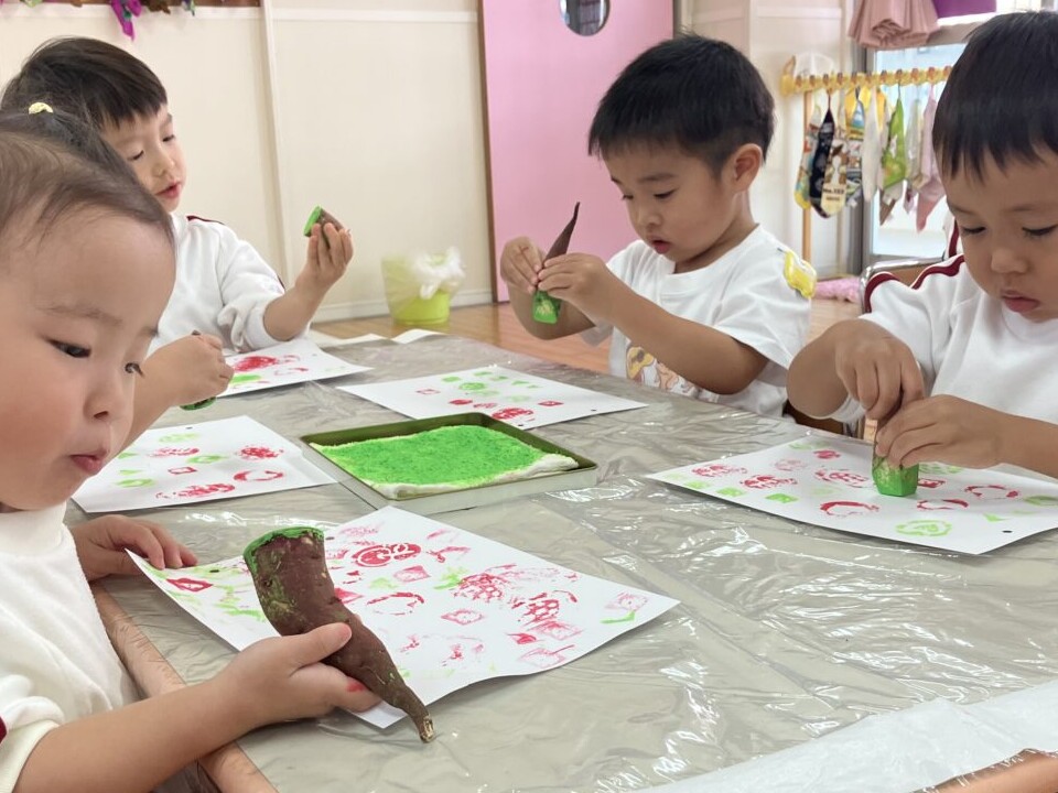 年長さんと年中さんが掘ってきてくれたお芋をおすそ分けしてもらって…芋スタンプ遊びをやってみました‼