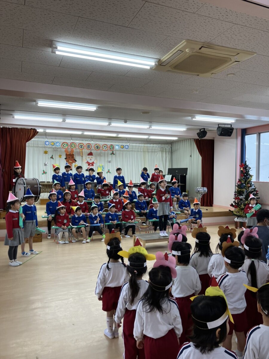 まずは年長組さんの合奏♬「ジングルベル」と「崖の上のポニョ」の曲で会場を盛り上げてくれました‼