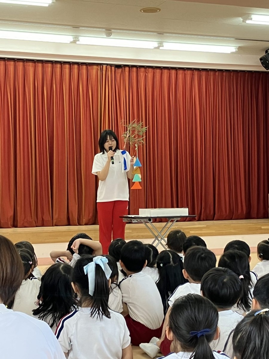 縁日ごっこのあとは、お給食を食べて…またまたホールに集まって、みんなでたなばた会に参加しました♪笹飾りについてお話を聞いたり、七夕についての先生たちの劇を観たりして、楽しく過ごしましたよ😊