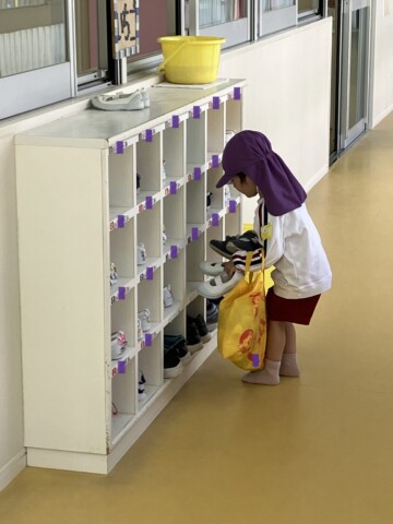 ここまで終わったら、トイレに行き、待ちに待ったお外遊びです。お茶を飲んで、カラー帽子をかぶったら「お外に行ってきます!」と元気に言って、お友だちと一緒にお外に行きますよ。自分で靴を履ける子も多く、あっという間に出かけていきます。