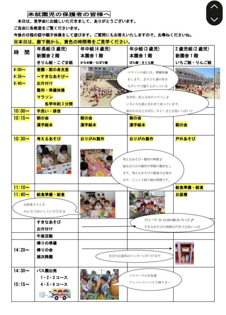 2024.08.26イベント情報お知らせ 見学会のお知らせ 9月4日(水) 9:30~☆見学会のお知らせ☆日時 9月4日(水) 9:30~対象 来年度以降、入園をお考えの保護者の方日頃の子ども達、先生達の様子や本園の雰囲気を実際に感じていただければ嬉しく思います!予約不要となっておりますので、お気軽にご参加ください!お待ちしてます♡福岡市 中央区 ふくはま幼稚園